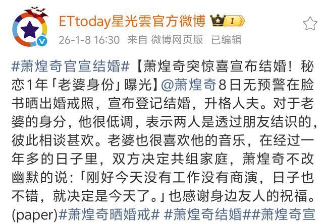 萧煌奇称和老婆是通过朋友认识的,很喜欢他的音乐,已经相处了一年多,两人觉得可以组成家庭。还说今天登记结婚是因为刚好没有工作和商演,日子也很好。