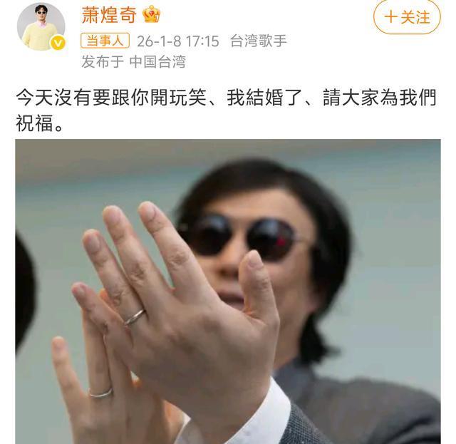 著名歌手萧煌奇今天宣布结婚,称“今天没有要跟你开玩笑中金辰大,我结婚了,请大家为我们祝福”。配上了和老婆戴婚戒的手部近图,女方没有出镜。