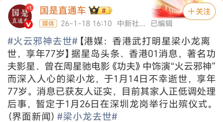 据港媒报道星速配资,77岁武打明星梁小龙于1月14日离世,家人暂定于26日在深圳为其举办葬礼。